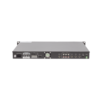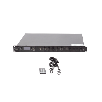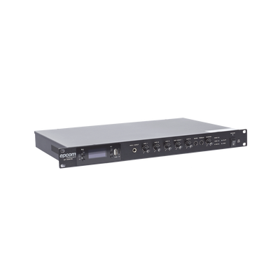 Mezclador / Amplificador de alta eficiencia para lugares donde se requiere reproducción de música de fondo simple, con un diseño compacto y sofisticado.