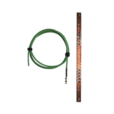 El Kit de puesta a tierra incluye una barra de cobre, cable calibre 6 AWG de 2 metros de largo terminado en un extremo con terminal de compresión de barril largo y orificio doble, hardware y accesorios de montaje.