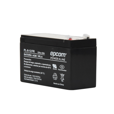 La serie de baterías EPCOM POWERLINE, están diseñadas con tecnología AGM-VRLA (Fibra de vidrio absorbente, con válvulas de regulación), placas de alto rendimiento y electrólito para proporcionar una salida de energía adicional. Las baterías de la serie EPCOM POWERLINE son baterías de respaldo para equipos electrónicos, con una vida útil de diseño flotante de 5 años a 25°C, aprobado por UL (MH64542).