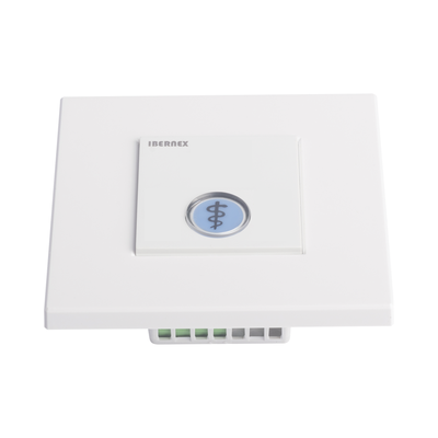 El botón iluminado permite desencadenar alarmas médicas así como registrar la presencia del personal en las habitaciones mediante la pulsación del botón verde o mediante el paso de la tarjeta RFID de 125 KHz.