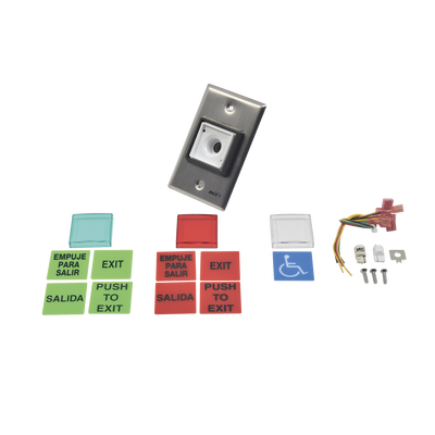 - Placas seleccionables con mensaje y una con símbolo para discapacitados: Presione para salir, Salir, en español e inglés y símbolo para Discapacitados