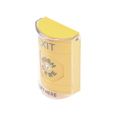 Botón de Salida, Texto en Ingles, Tapa Protectora de Policarbonato Súper Resistente, Llave para restablecer, Bocina integrada de Advertencia