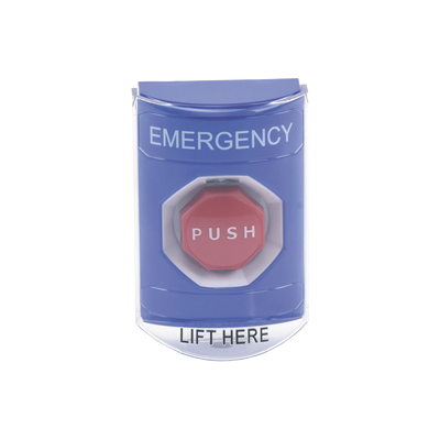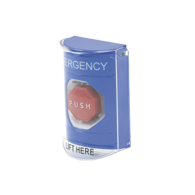 Botón Multipropósito, Color Azul, De Superficie, Con Tapa De Policarbonato, Con Bocina Pre Alarma, Para Interior, Llave Para Restablecer, Texto De Emergencia, Ingles
