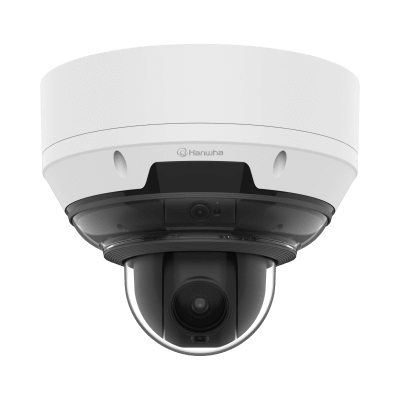La cámara AI PNM-C19183RVTP de Hanwha Vision combina una cámara fija de 5MP con 3 canales y una cámara PTZ de 4MP con zoom óptico de 18x en un diseño compacto y todo en uno. Equipada con un motor de inteligencia artificial avanzado, ofrece detección de objetos (personas, vehículos, matrículas), análisis de video inteligente (IVA) y funciones de inteligencia empresarial como conteo de personas y vehículos. Con certificación IP66, iluminación IR de hasta 15 metros y soporte para PoE++, es ideal para aplicaciones de seguridad exigentes en exteriores.