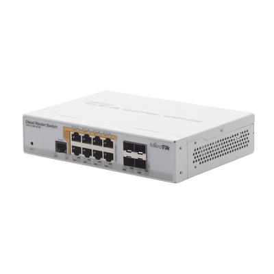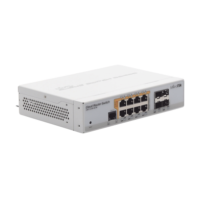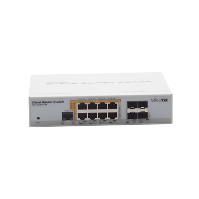El CRS112-8P-4S-IN es un Switch PoE con 8 puertos Gigabit RJ45 que ofrece opciones de alimentación: detección automática 802.3af/at PoE/PoE+ y PoE pasivo, junto con 4 puertos SFP para conectividad de fibra óptica con enlaces ascendentes de hasta 1 Gbps.