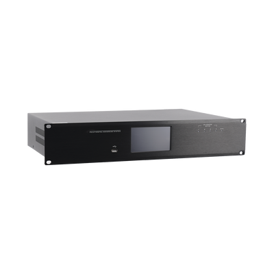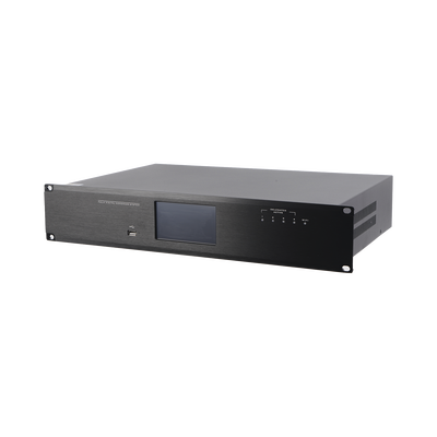 El dispositivo cuenta con tecnología de transmisión síncrona de reloj de audio, con un retraso de audio de menos de 5 ms. Además, incorpora un procesador DSP de alto rendimiento con funciones de matriz de audio, supresión de feedback, ecualización, ajuste de volumen y retraso. Sus interfaces de entrada y salida de audio admiten múltiples conectores y canales de salida, con capacidad para hasta 4096 unidades de conferencia cableadas y 300 inalámbricas. Ofrece modos de salida flexibles, control a través de TCP/IP, acceso web para configuración y control de parámetros de matriz de audio, y funciones avanzadas como interpretación simultánea, seguimiento automático de cámaras y gestión de micrófonos.