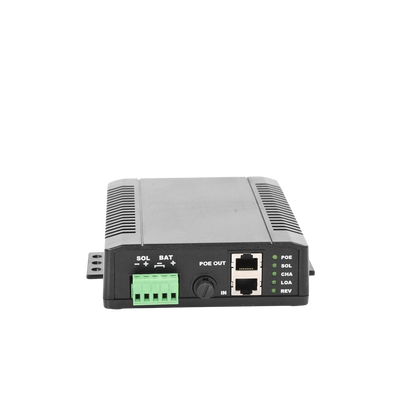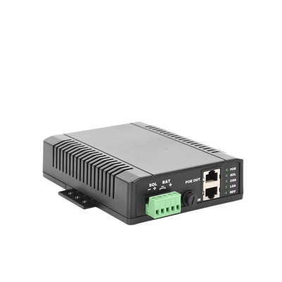 Sistema de controlador solar que regula la carga y descarga de baterías, suministrando alimentación PoE de 48 Vcc @ 0.625 A. Incluye salida secundaria de 11-12.5 Vcc a 1.5 A máxima para alimentación de dispositivos IP.