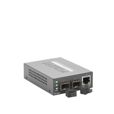 El GT-1205A está equipado con un puerto 10/100/1000BASE-T y dos ranuras SFP para admitir la conversión entre redes 10/100/1000BASE-T y 100/1000BASE-X. Las ranuras SFP duales hacen que las señales Ethernet se conecten de manera fácil y eficiente al agregar módulos de medios monomodo o multimodo o la combinación de ambos tipos. El GT-1205A brinda alta confiabilidad y flexibilidad para extender la distancia de transmisión de medios hasta 550 m o 2 km (fibra multimodo) y 10 km o más 20/40/80/120 kilómetros (fibra monomodo o fibra WDM), dependiendo de los módulos 100/1000BASE-SX/LX SFP opcionales.