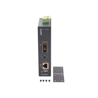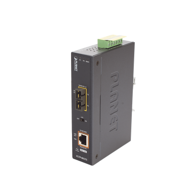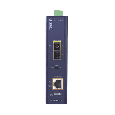El convertidor de medios industrial Gigabit de PLANET IGTP-802TS (1000BASE-X a 10/100/1000BASE-T) con inyector 802.3at Power over Ethernet Plus (PoE +) para entregar hasta 30 Watts. Su puerto de enlace ascendente de fibra óptica 1000BASE-X proporciona a distancias grandes altas velocidades y transmisiones de datos estables a una red central remota.