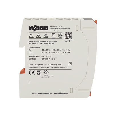 Fuente de alimentación industrial Eco 2 monofásica diseñada para aplicaciones profesionales en automatización y control. Entrega una tensión nominal de 24V DC con corriente de salida de 1.25A y potencia máxima de 30W. Incorpora tecnología de conexión Push-in CAGE CLAMP® para terminación rápida sin herramientas. Cumple con estándares de seguridad SELV/PELV según EN 61010/UL 61010, ofreciendo protección eléctrica avanzada. Ideal para montaje en carril DIN-35 en entornos industriales con rango de temperatura de operación desde -25°C hasta +70°C.