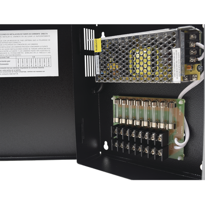 Fuente de poder profesional CCTV de 12-13.2Vdc @5A, 8 cámaras, Volt. de entrada: 100-240 Vca (Fusibles Administrables)