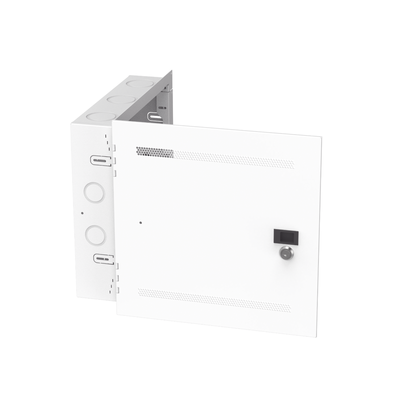 El gabinete multiusos para montaje en pared está diseñado para albergar conectividad de punto de transición y proporcionar un espacio para montar equipos de red empotrados en la pared, al mismo tiempo que brinda flexibilidad para acomodar movimientos futuros. El gabinete está construido con acero de calibre 18 y con accesorios con un diseño de empujar/tirar. Tiene una puerta con cerradura y está diseñada para permitir una ventilación adecuada para su uso con diversos equipos, entre otros, dispositivos AV u ONT, conexiones de cobre y conexiones de fibra.