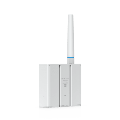 Gateway para sensores SuperLink con gestión en UniFi Protect, conectividad Bluetooth 5.2 y SuperLink propietario, alcance de hasta 2 km en SuperLink y montaje en pared o riel DIN.