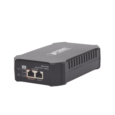 PLANETA POE-175-95 es un solo puerto, inyector de alimentación a través de Ethernet 802.3bt, con un máximo de hasta 95 vatios de potencia de salida durante los cables Ethernet.