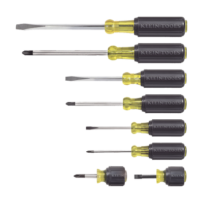 Juego de 8 Desarmadores con Mango Cushion-Grip™: 2 de punta Plana de 1/4'' (6.4 mm) y 5/16'' (7.9 mm); 2 de punta Cabinet de 5/16'' (7.9 mm) y 3/16'' (4.8 mm); tres de punta Phillips n.º 1, n.º 2 y n