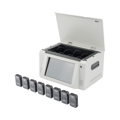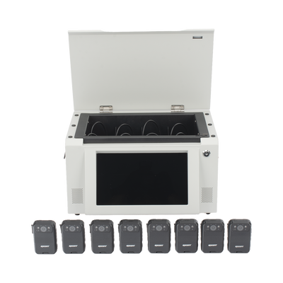 Estación para BodyCam, realiza la descarga de información y carga de batería simultáneamente, la estación se conecta por Ethernet para la descarga de información al servidor central dedicado (FTP).