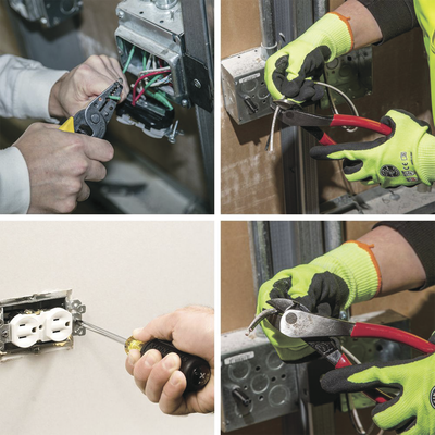 • Juego de llaves hexagonales plegables Pro (Cat. n.º 70550), probador de voltaje sin contacto de doble rango con linterna (Cat. n.º NCVT-3P), probador de receptáculo GFCI (Cat. n.º RT210)