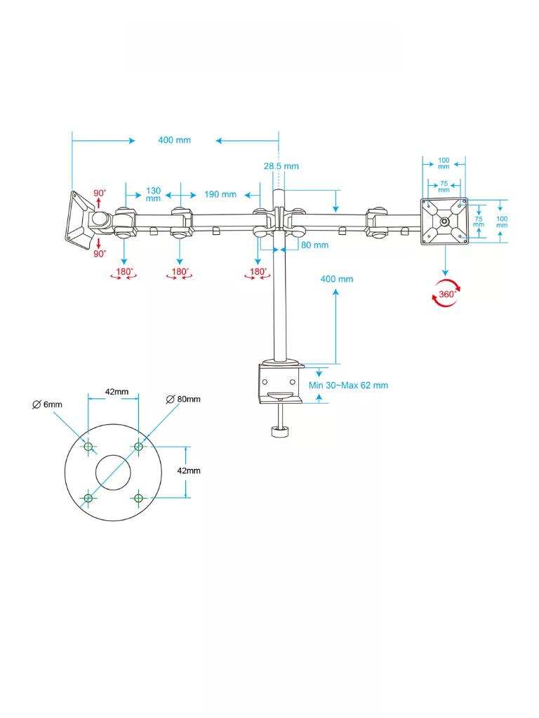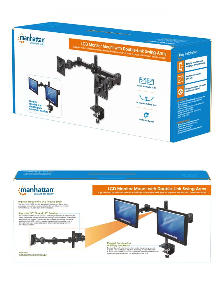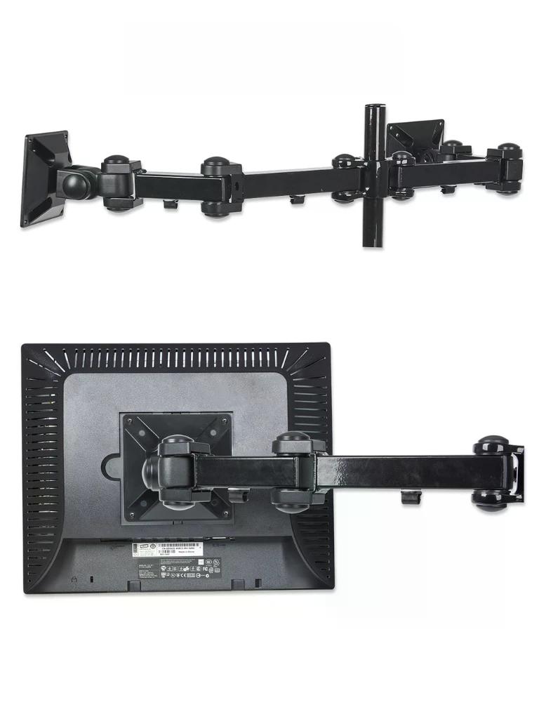 El Soporte para Monitor LCD Manhattan con brazos articulados de doble enlace está diseñado para optimizar el espacio de trabajo y mejorar la ergonomía. Permite montar hasta dos monitores de 13” a 24”, elevándolos a una altura ideal para una visualización cómoda y profesional.