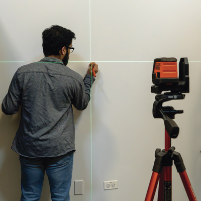 - El láser de alta precisión proyecta líneas limpias con una precisión de 3/16” a 33′ (10 m); la detección automática de desnivel hace que el láser parpadee cuando deja de estar nivelado