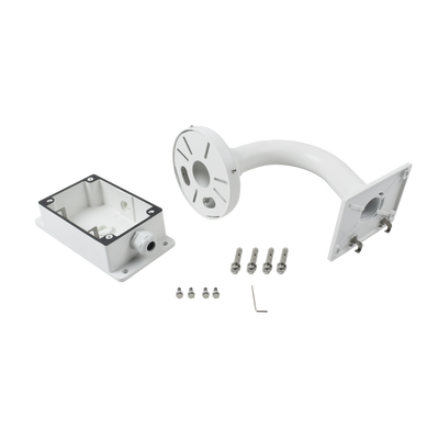 Montaje universal cuello de ganso para cámaras domo y bala, incluye la caja de conexiones robusta para instalación en exterior, el diseño del cuello evita que algún líquido regrese a la caja de conexión.