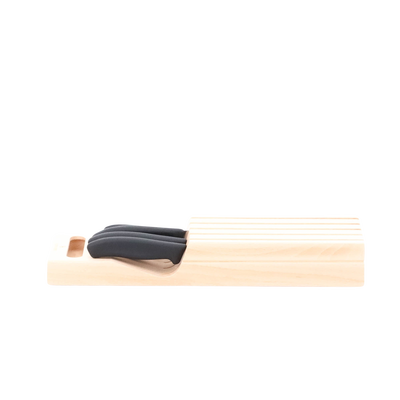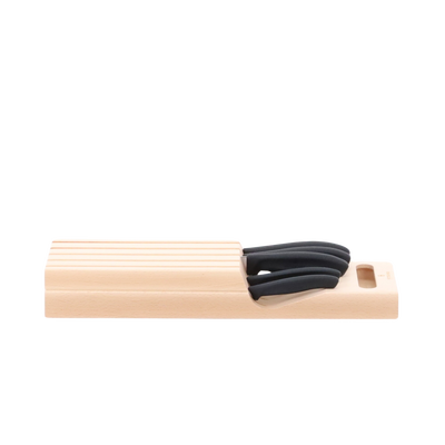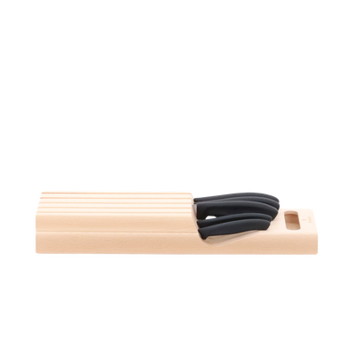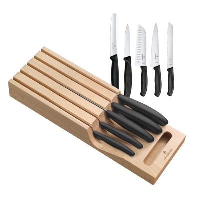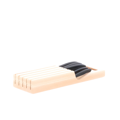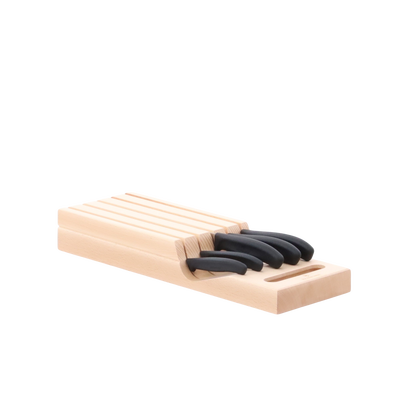 La gran funcionalidad, la apariencia atractiva y el diseño ergonómico y sofisticado colocan en un nivel único a esta solución compacta de almacenamiento en la cocina. Nuestro portacuchillos de cajón Swiss Classic es una nueva interpretación del bloque de cuchillos tradicional, que liberará espacio en su barra de cocina gracias al almacenamiento seguro e inteligente de las filosas hojas de cinco cuchillos. Confeccionado con resistente madera de haya y en tonos atractivos, las ranuras diseñadas con habilidad tienen la forma e inclinación adecuadas para guardar los cuchillos fácilmente.