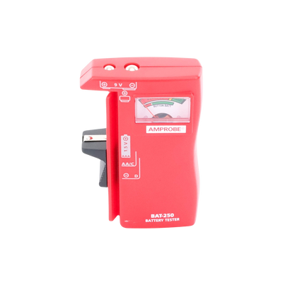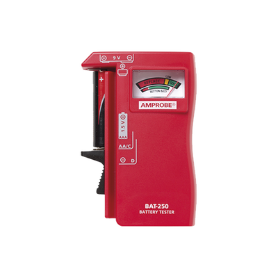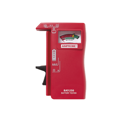El probador de batería Amprobe BAT-250 está diseñado para mediciones de batería con una mano, cómodas y fiables. El probador diseñado de forma única ofrece un deslizador ergonómico y un espacio lateral en forma de v para mantener mejor las baterías en su lugar durante las pruebas y una forma contorneada que se ajusta perfectamente en su mano. Probando baterías nunca había sido más fácil.