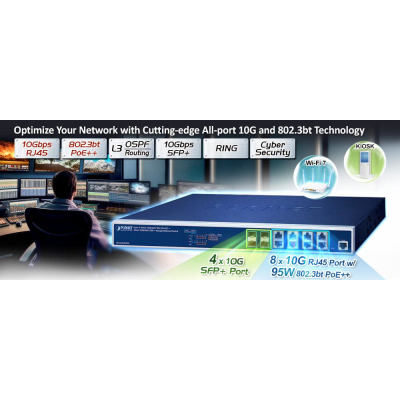 El Switch Ethernet Gestionado Layer 3 PLANET XGS-6320-8UP4X está diseñado para redes de alta velocidad y dispositivos que requieren gran potencia, como puntos de acceso Wi-Fi 7/6E, sistemas de vigilancia y NAS. Con 8 puertos 10GBASE-T y 4 puertos 10GBASE-X SFP+, ofrece conectividad flexible y un presupuesto PoE de 420W, compatible con IEEE 802.3bt PoE++ para suministrar hasta 95W por puerto. Ideal para entornos empresariales y ciudades inteligentes, este switch combina capacidades avanzadas de routing Layer 3, gestión de VLAN y QoS, junto con funciones de seguridad robustas.