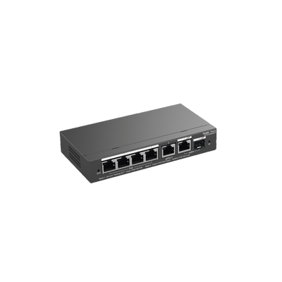 Switch Administrable con 4 puertos Gigabit PoE, 2 Uplink Gigabit y 1 Uplink Gigabit para Fibra SFP en combo, gestión gratuita desde la nube