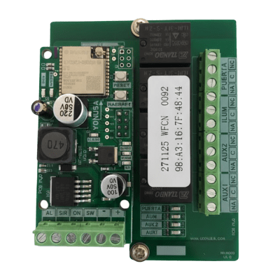 Tarjeta de comunicación Wi-Fi para control remoto de cercos eléctricos, diseñada para integrarse con la aplicación móvil Yonusa Plus. Permite el control y monitoreo remoto de hasta 5 dispositivos ON-OFF mediante salidas de relé, incluyendo activación de cercos eléctricos, botones de pánico, iluminación, y sistemas auxiliares. Incorpora indicadores LED para diagnóstico de estado y comunicación, con capacidad para conexiones de 12Vdc hasta 240Vac a 10A. La tarjeta opera en la banda de 2.4GHz con cifrado WPA/WPA-2 y ofrece conectividad a través de red inalámbrica para integración con sistemas de seguridad residenciales y comerciales.