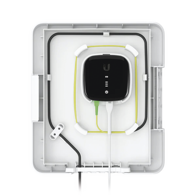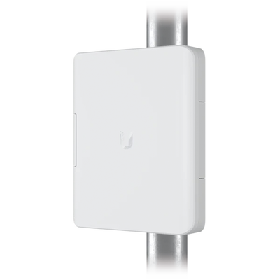 Caja para exteriores resistente a la intemperie y montable en poste, diseñada para proteger dispositivos de fibra óptica en instalaciones UISP / UFiber.