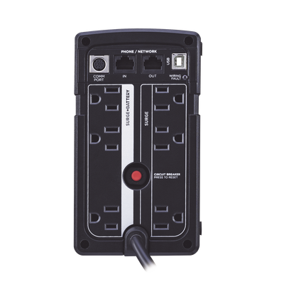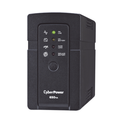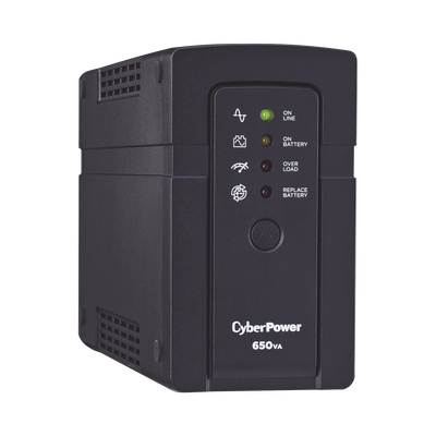 El UPS RT650 de CyberPower provee respaldo (usando onda senoidal simulada a la salida) y protección contra sobretensiones para sistemas de computadoras en kioskos, máquinas de tarjetas de crédito e impresoras de recibos. El tamaño del RT650 lo permite ajustarse fácilmente debajo de escritorios u otros espacios apretados pero a pesar de su chassis compacto la batería interna proveerá larga duración de respaldo de potencia al equipo conectado.
